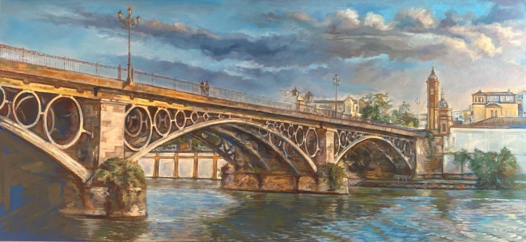 Por último, la pintura de Ramón Martín Orta. Rubio, cierra el almanaque con una metáfora preciosa del tiempo, representado en un atardecer en el puente de Isabel II que se encuentra en Triana. Un puente entre la ciudad de Sevilla y su arrabal, Triana. Representa la alegría infinita de cruzar la fina línea que separa un año viejo de uno nuevo, acompañado por el agua cambiante y fulgurante que se transforma segundo a segundo.