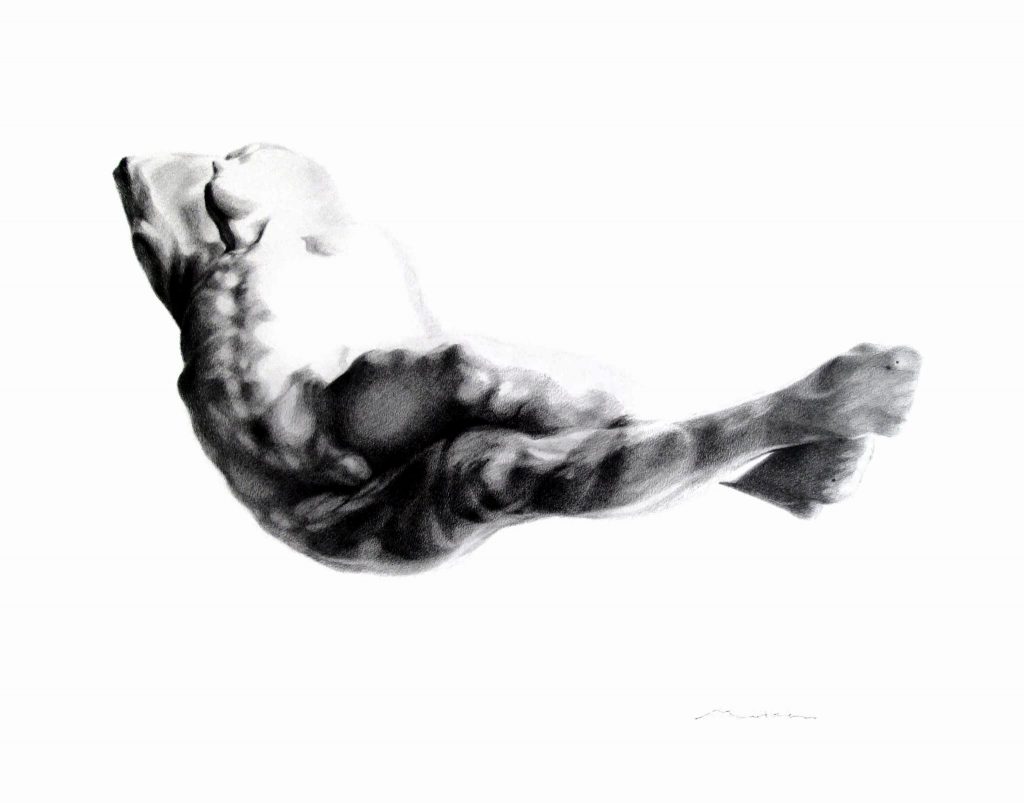 El mes de julio lleva un maravilloso dibujo del escultor José Manuel Martínez Pérez, Martínez, Ingrávido. Dibujo realizado en grafito sobre la referencia fotográfica de una escultura a la que le estaba haciendo el molde de silicona el escultor. La luz y la sombra están invertidas, en negativo, para construir una realidad discordante.