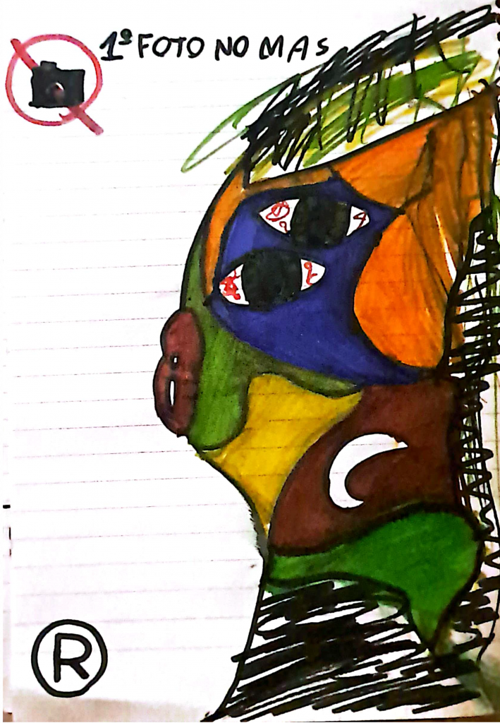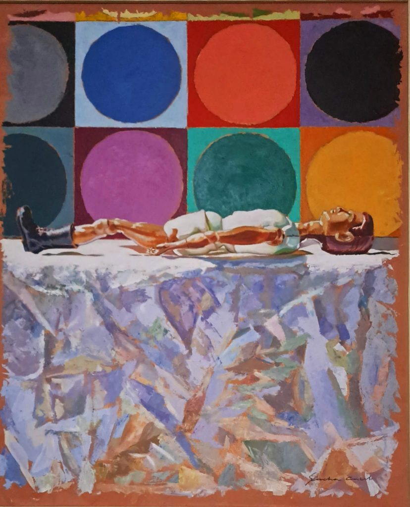 Esta pintura pertenece a una serie llamada “El juego de la memoria” donde utilizo recuerdos, juguetes y otros objetos de mi infancia para, a modo de «collage», contar historias.(recurso que utilizan los niños a veces en sus juegos).En ella podemos ver a un «maderman» mutilado, postrado en una tela blanca, recuerdo del santo entierro de mi pueblo y un telón de fondo que es la guarda de un libro de EGB (Senda).