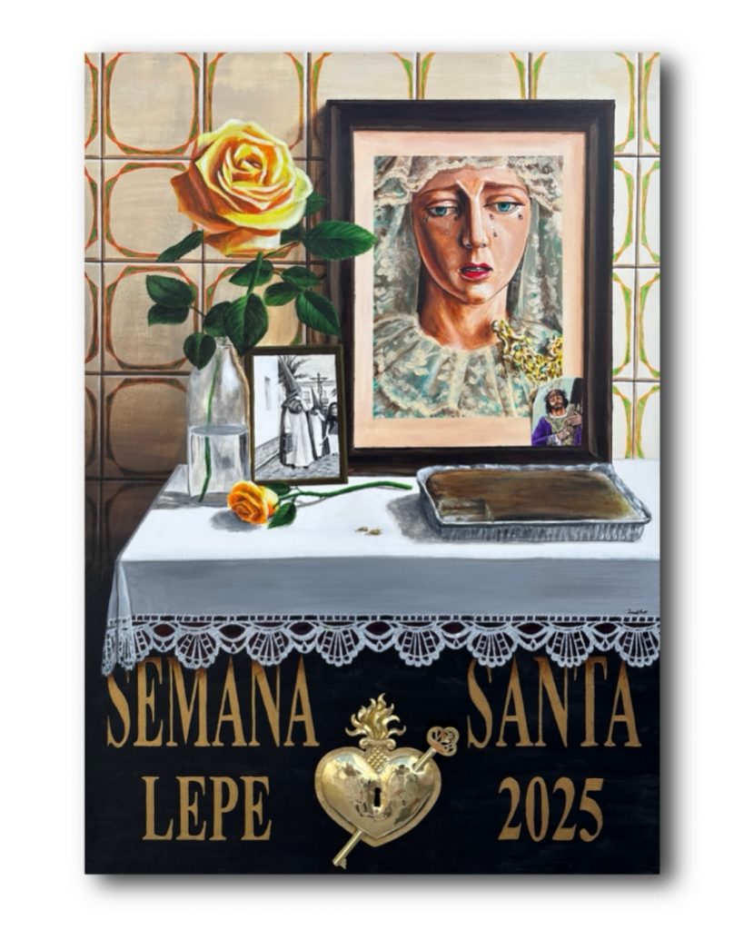 El propio autor del cartel explicó brevemente la inspiración detrás de su creación, realizada en técnica mixta sobre tablero. En su interpretación, el pintor evoca la imagen de una cocina tradicional de abuelas, con ese típico azulejo de los años 70 y 80 y un mantel de ganchillo. En este escenario, destaca la figura de Nuestra Señora del Amor enmarcada y apoyada en la pared. Acompañada de una pequeña estampita de Padre Jesús y otros elementos cargados de simbolismo: una antigua fotografía del Cristo de la Misericordia, el nostálgico sonido de una matraca portado por un nazareno, un jarrón con una rosa amarilla y detalles como una bandeja de coca y una inscripción en letras de oro. Todos estos elementos se conjugan para rendir homenaje a las tradiciones, la devoción y los recuerdos de un pasado que sigue presente en la memoria colectiva de Lepe.