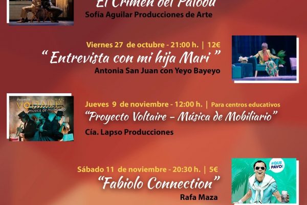 El Teatro Municipal “Alcalde Juan Manuel Santana” presenta un adelanto de su Otoño Cultural. Las obras “El crimen del palodú”, “Entrevista con mi hija Mari” y “Fabiolo Connection”, el espectáculo “Proyecto Voltaire – Música de Mobiliario” y a la actuación de María Terremoto se encuentran entre las propuestas culturales para los próximos meses en Lepe….