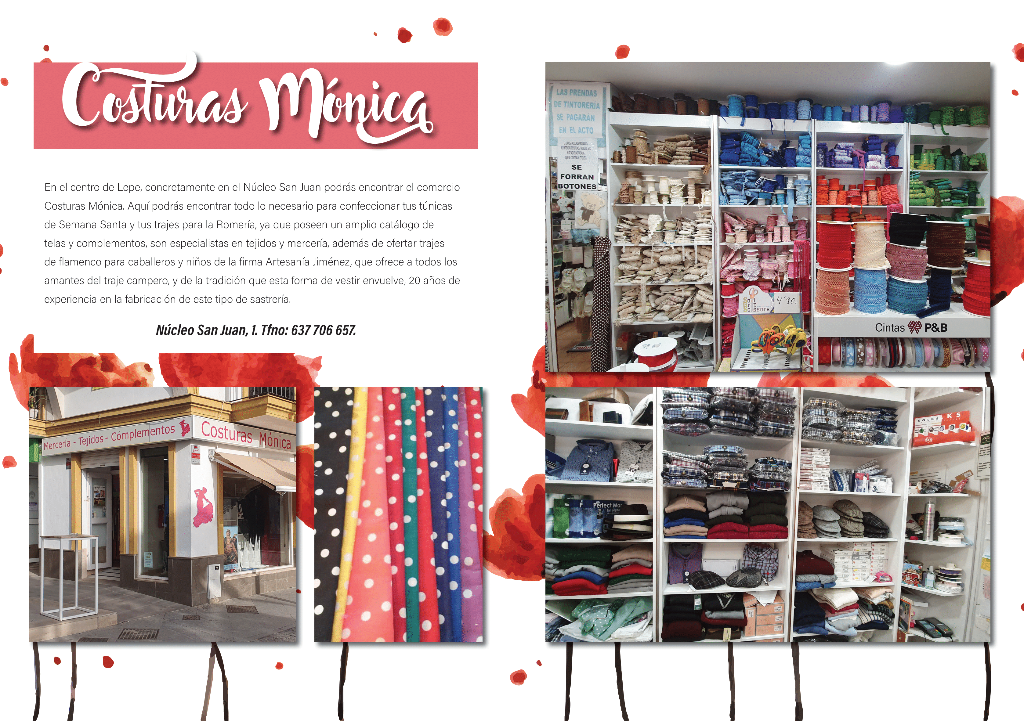 En el centro de Lepe, concretamente en el Núcleo San Juan podrás encontrar el comercio Costuras Mónica. Aquí podrás encontrar todo lo necesario para confeccionar tus túnicas de Semana Santa y tus trajes para la Romería, ya que poseen un amplio catálogo de telas y complementos, son especialistas en tejidos y mercería, además de ofertar trajes de flamenco para caballeros y niños de la firma Artesanía Jiménez, que ofrece a todos los amantes del traje campero, y de la tradición que esta forma de vestir envuelve, 20 años de experiencia en la fabricación de este tipo de sastrería.
