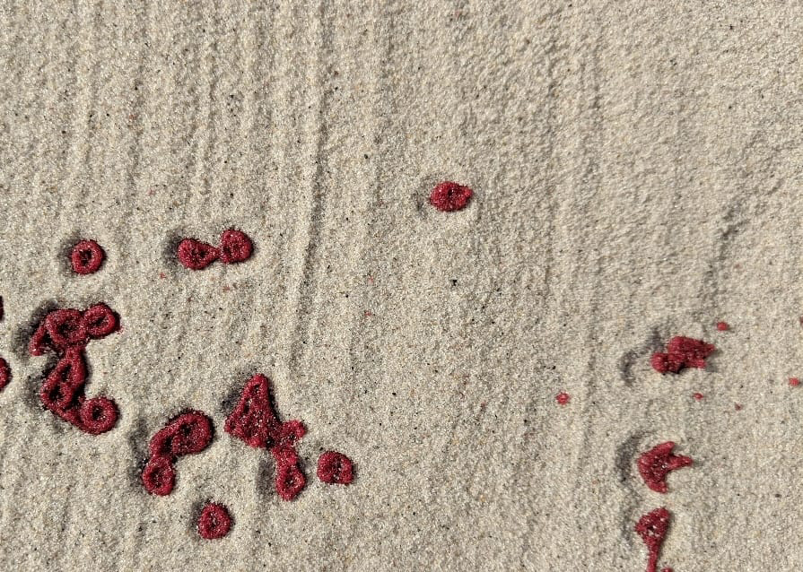 El policía tragó saliva, encendió la linterna y efectivamente pudo visualizar manchas rojas que parecían de sangre. Se colocó unos guantes y tomó pruebas del lugar. Además de las manchas rojas, también colocó en otras bolsas areniscas que encontró repartidas en el lugar.