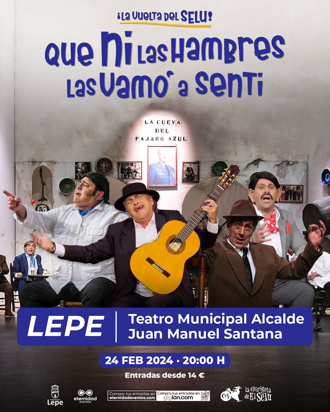 El Teatro Municipal de Lepe se prepara para acoger la actuación de la Chirigota del Selu “Que ni las hambres las vamo’ a sentí”. Un clásico del Carnaval gaditano que visitará Lepe el próximo 24 de febrero a las 20:00 horas, el espectáculo carnavalero tendrá lugar en el Teatro Municipal de Lepe Juan Manuel Santana. El precio de las entradas asciende a 14 euros y pueden adquirirse mediante forma online o física en las taquillas del teatro.