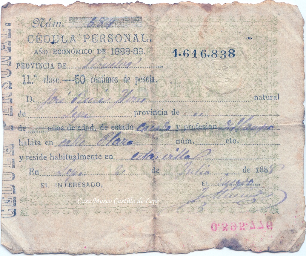 FOTO 4.- Célula personal equivalente al DNI, en el año de 1.888.