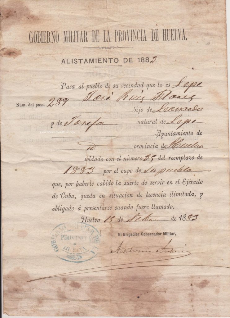 FOTO 3.- Ficha de alistamiento para la guerra de Cuba, en el año de 1.883.