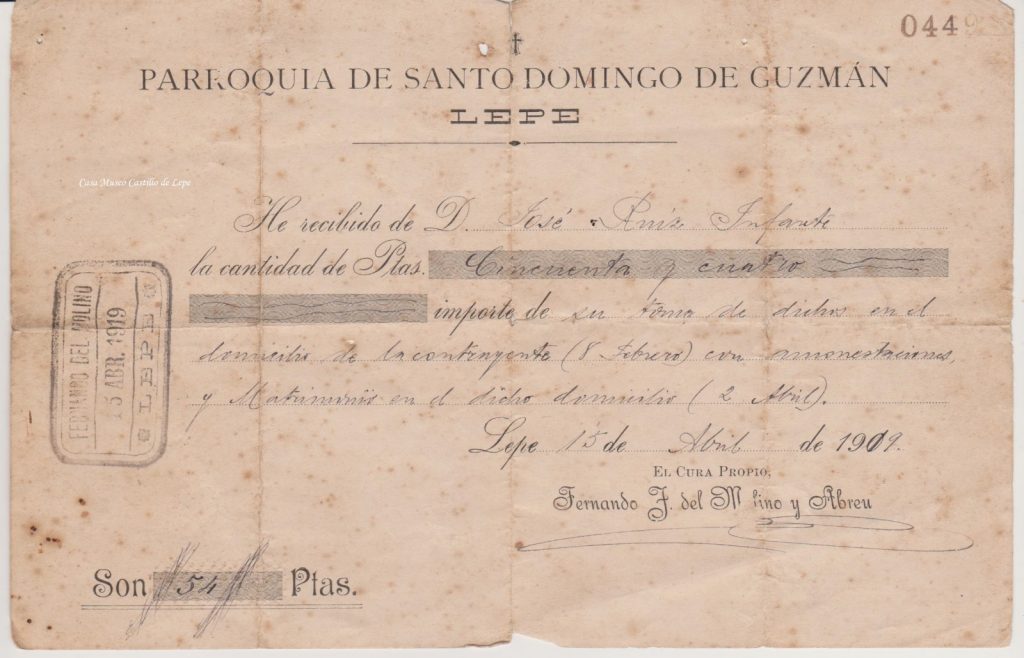 FOTO 8.- Recibo como pago de Amonestaciones Matrimoniales a la parroquia Santo Domingo de Guzmán, en el año 1.909.